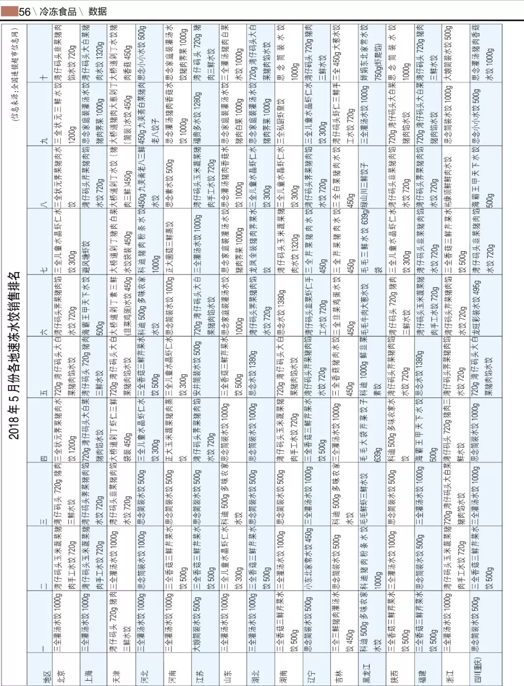 ▼2018年5月份各地速凍水餃銷售排名