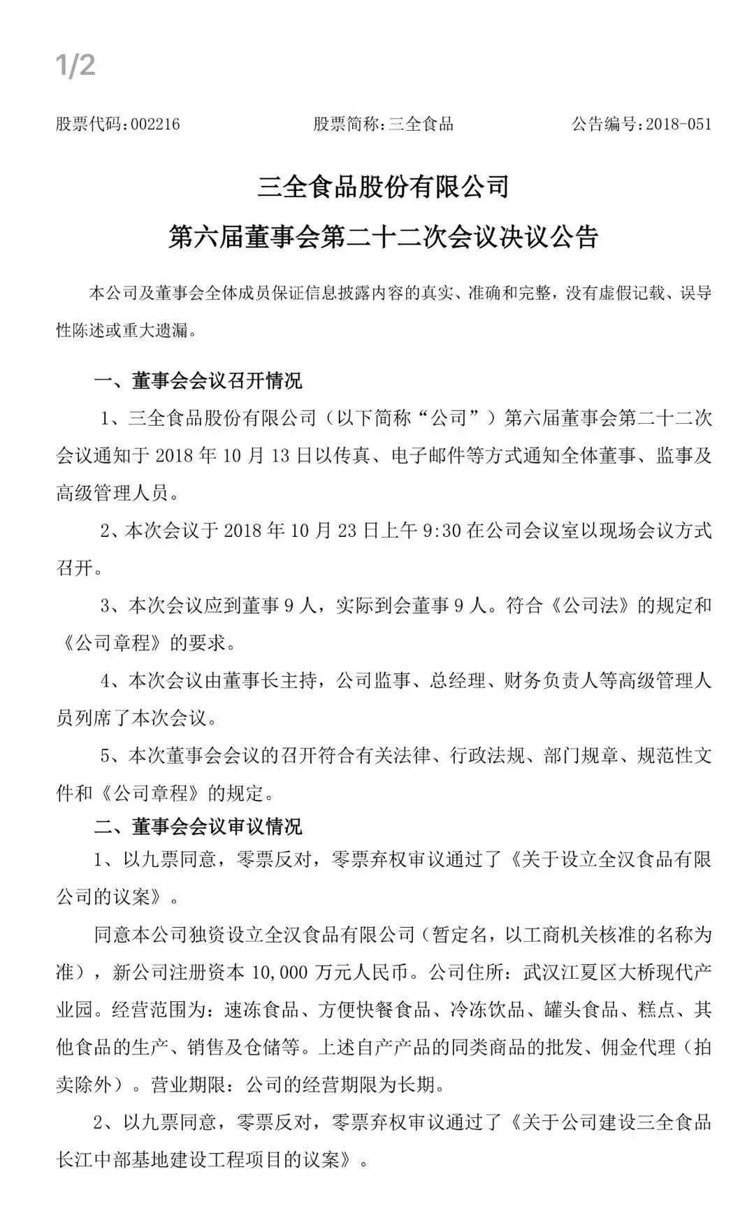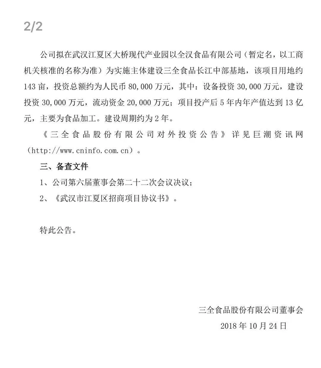 10月17日,安井食品與湯陰縣人民政府簽約,擬投資3億元建華北生產基地。今天,三全食品又發公告稱,擬投資8億元在武漢建設長江中部基地。