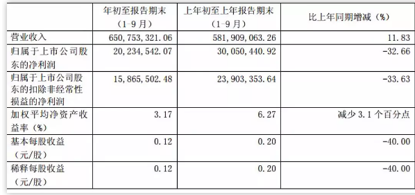 公告顯示,公司前三季度實(shí)現(xiàn)營(yíng)業(yè)收入 6.51億元,較上年度同期5.82億增長(zhǎng)11.83%;凈利潤(rùn)2,023萬元,較上年度同期3,005萬元下降32.66%。