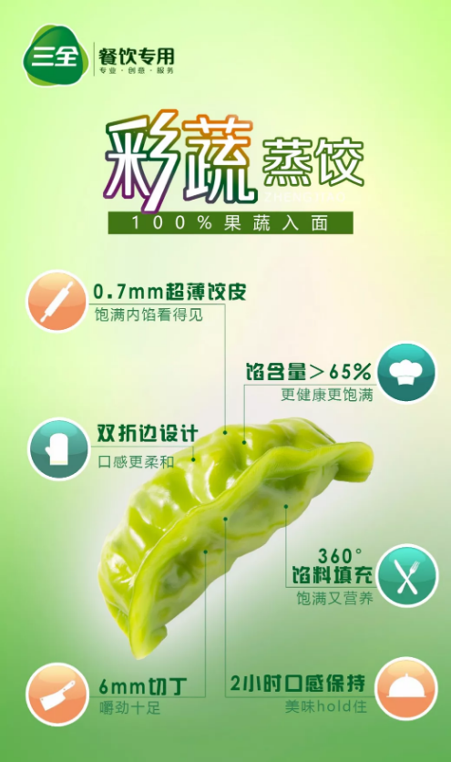 問題的另一面,就是機會。這一次,向來以創新為驅動力的三全餐飲,決定邁出開拓性的一步:重磅推出彩蔬素餡蒸餃,并全面進軍連鎖餐飲渠道。
