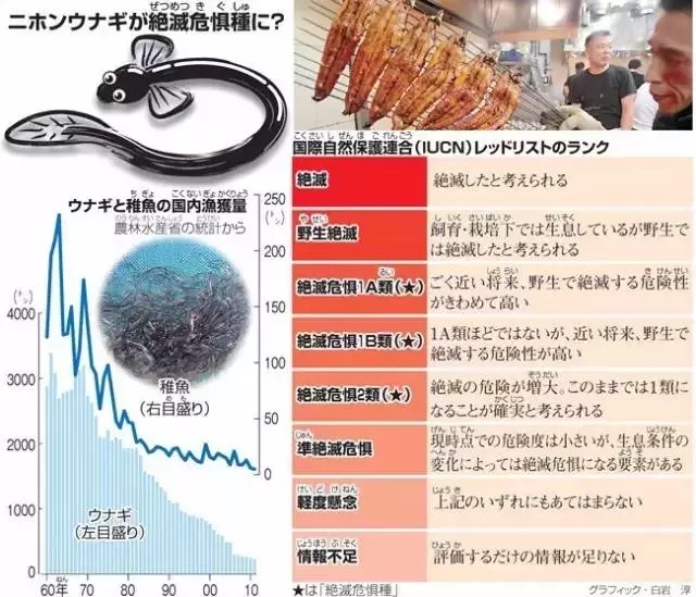 國際自然保護聯盟(IUCN)將日本鰻鱺和美洲鰻鱺列為瀕危(EN)物種,而歐洲鰻鱺甚至被列為了極危(CR)物種,這三種鰻魚的野生種群受到了嚴重威脅。