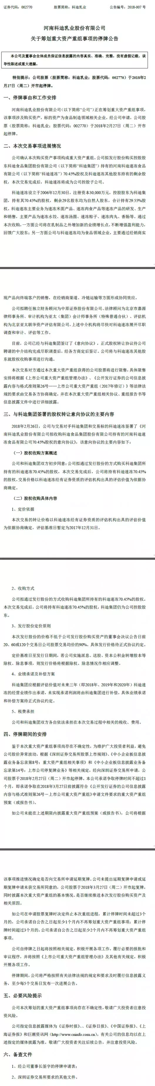 來源: 投實 發(fā)布者:編輯2月26日,科迪乳業(yè)發(fā)布關(guān)于籌劃重大資產(chǎn)重組事項的停牌公告,公司正在籌劃重大資產(chǎn)重組事項,該事項涉及購買資產(chǎn),標的資產(chǎn)為食品制造領(lǐng)域相關(guān)企業(yè)。