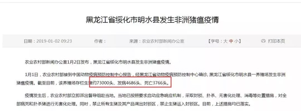 就在大家以為疫情趨緩之時(shí),元旦過后第一天,2019年1月2日上午9點(diǎn)半,農(nóng)業(yè)部發(fā)布了黑龍江省綏化市明水縣發(fā)生非洲豬瘟疫情,該養(yǎng)殖場存欄生豬約73000頭、發(fā)病4686頭、死亡3766頭。