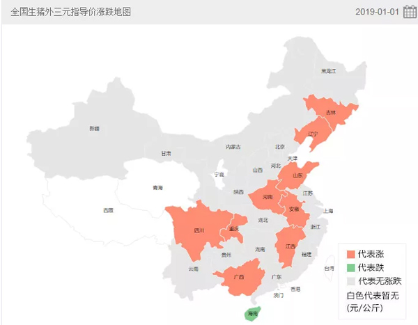 △豬e網(wǎng)統(tǒng)計(jì)的2019年1月1日全國生豬外三元指導(dǎo)價(jià)漲跌地圖