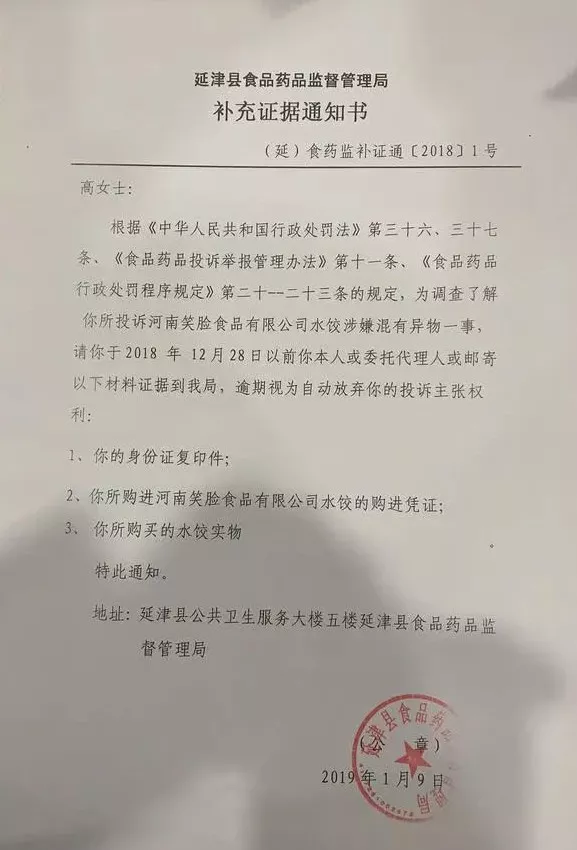 在這份《補充證據(jù)通知書》上,延津縣食藥監(jiān)局稱,為調(diào)查高女士所投訴的河南笑臉食品有限公司水餃涉嫌混有異物一事,高女士應(yīng)在2018年12月28日以前本人或委托代理人或郵寄材料證據(jù)到當(dāng)?shù)厥乘幈O(jiān)局,逾期視為自動放棄投訴主張權(quán)利。加蓋公章的文件落款時間為2019年1月9日。