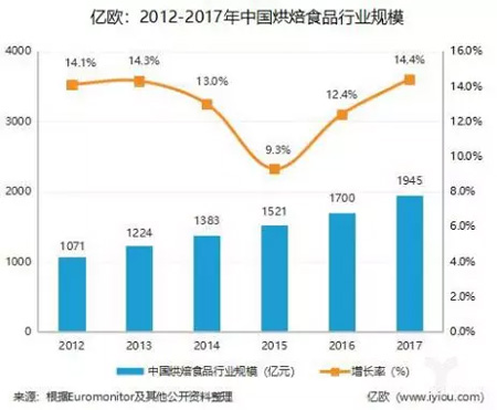 有大數(shù)據(jù)為證。2012—2017年,五年間,我國(guó)烘焙產(chǎn)品的銷售額已由1071.02億元增長(zhǎng)到1944.79億元。