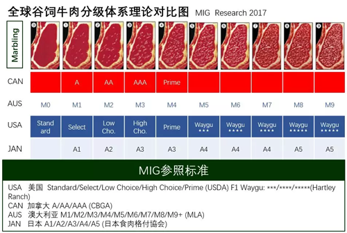 最后,由于分級(jí)體系的不同,我們一起橫向梳理一下全球谷飼牛肉分級(jí)體系的對(duì)應(yīng)關(guān)系: