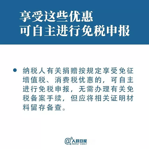 ●支持公益捐贈。全力落實好公益性捐贈稅前扣除政策。單位和個人通過合規途徑無償捐贈自產、委托加工或購買的貨物,免征增值稅、消費稅、城市維護建設稅、教育費附加、地方教育附加;企業和個人通過合規途徑捐贈的現金和物品,允許計算應納稅所得額時全額扣除;個人公益捐贈不能提供捐贈票據的,可憑銀行支付憑證扣除,并在90日內補充提供捐贈票據;機關、企事業單位統一組織員工公益捐贈的,可憑匯總捐贈單據和員工明細單扣除。