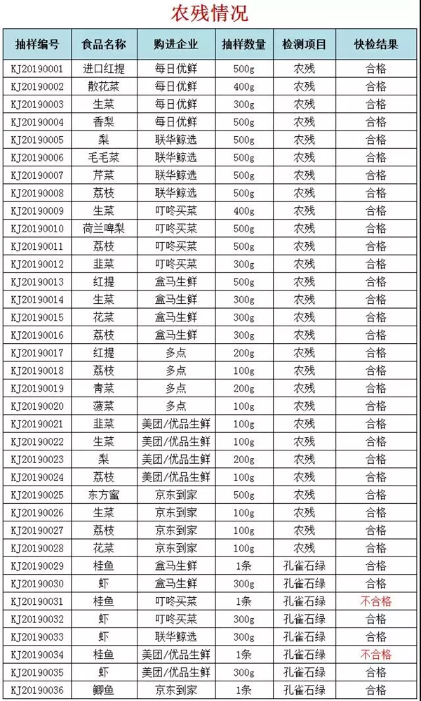 在農藥殘留方面,此次評測市消保委邀請了市藥檢院快檢中心,通過食品快速檢測的方式對測評中購買的果蔬生鮮的農藥殘留情況進行檢測,檢測結果顯示,所購果蔬類商品都未檢出農殘,但在“叮咚買菜”和“美團”這兩家平臺所購買的桂魚均被檢測出孔雀石綠成分。