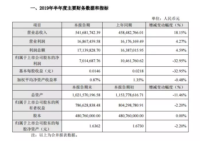 公告顯示,公司2019年1-6月實現(xiàn)營業(yè)收入5.42億元,同比增長18.15%;歸屬于上市公司股東的凈利潤701.47萬元,同比下降32.95%。