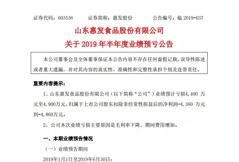 7月26日下午,惠發(fā)股份發(fā)布公告表示,預(yù)計2019年半年度業(yè)績虧損4400 萬元至4900萬元,歸屬于上市公司股東扣除非經(jīng)常性損益后的凈利潤-4360 萬元到-4860萬元。