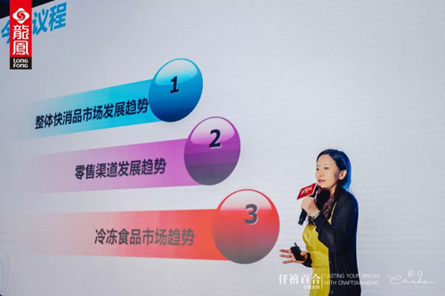 龍鳳食品市場總監(jiān)李聰博在會上發(fā)言,總結(jié)了加入三全體系的六年間,龍鳳做的八件事,并為多款新品“代言”。