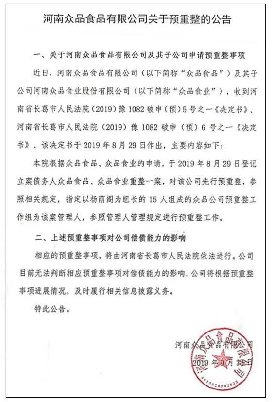 9月23日,眾品食品發(fā)布公告稱,近日,公司及其子公司眾品食業(yè)收到河南省長(zhǎng)葛市人民法院下發(fā)的有關(guān)破產(chǎn)重整的決定書。上述法院根據(jù)眾品食品、眾品食業(yè)的申請(qǐng),已于2019年8月29日登記立案?jìng)鶆?wù)人眾品食品、眾品食業(yè)重整一案,對(duì)該公司先行預(yù)重整。