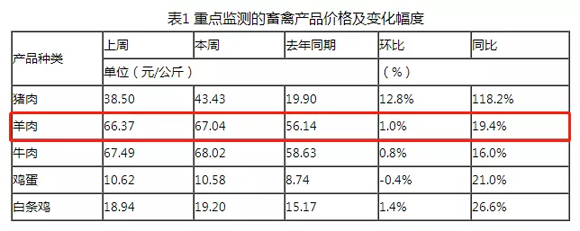 數(shù)據(jù)還顯示,截至上周,國內(nèi)牛、羊肉批發(fā)價格分別在67.49元/公斤、66.37元/公斤,去年羊肉批發(fā)價格高點在60元/公斤左右。