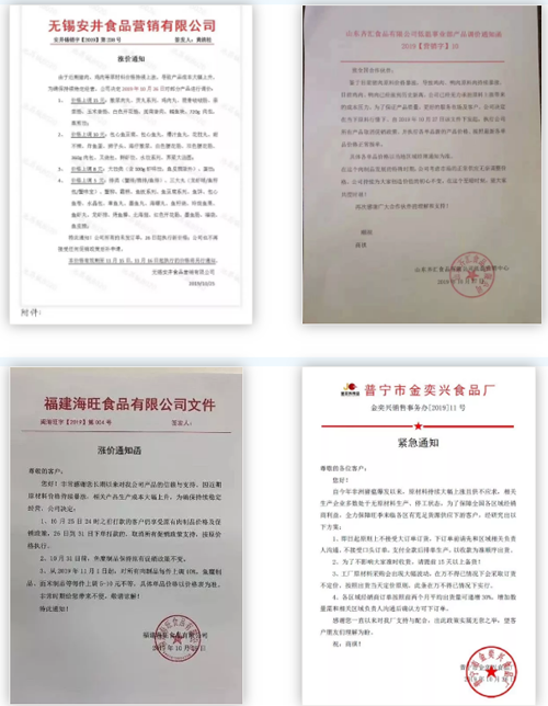 作為速凍行業的火鍋料巨頭,安井食品這次也坐不住了,于10月25日發布產品通知函。另外,海旺食品、齊匯食品、御味香、味之佳等企業也接連發布了最新的漲價消息: