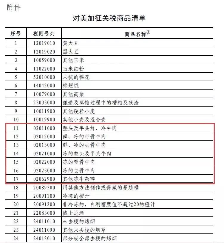當天,根據《中華人民共和國對外貿易法》和中華人民共和國進出口條例相關規定,及經國務院批準,國務院關稅稅則委員會決定,對原產于美國的大豆、汽車和牛肉等14類106項商品加征25%關稅。