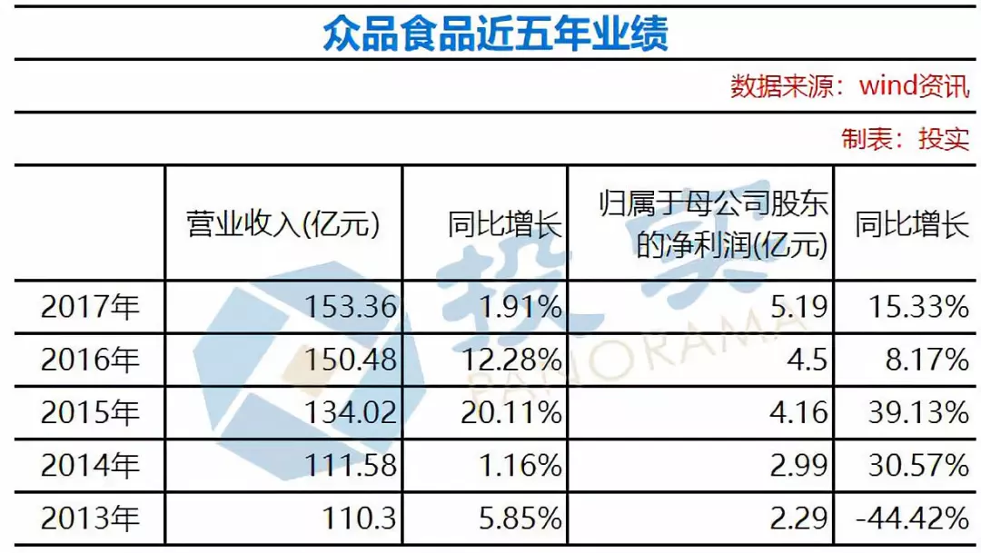 2017年,眾品食品實現營業收入153.36億元,同比增長1.91%,歸屬于母公司股東的凈利潤5.19億元,毛利率9.44%。