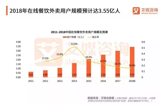 iiMedia Research(艾媒咨詢)數(shù)據(jù)顯示,2017年中國在線餐飲外賣用戶規(guī)模較2016年增長19.1%,正式突破3億人,2018年預(yù)計將達到3.55億人。