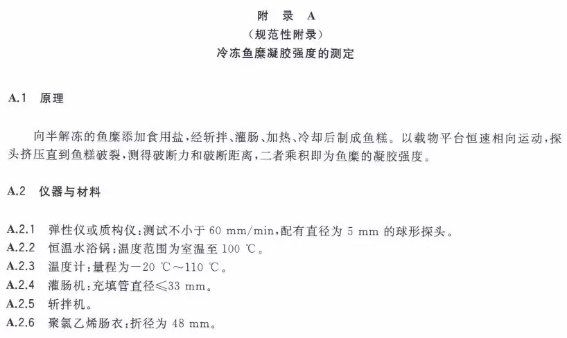 第四,規范性附錄中有關冷凍魚糜凝膠強度的測定,唯一值得商榷的是“斬拌機”。實踐中,魚糜實驗用“斬拌機”的類型不同,對魚糜凝膠性數據影響較大。使用不同類型的“斬拌機”做實驗,很容易引起供銷雙方對質量數據的質疑。