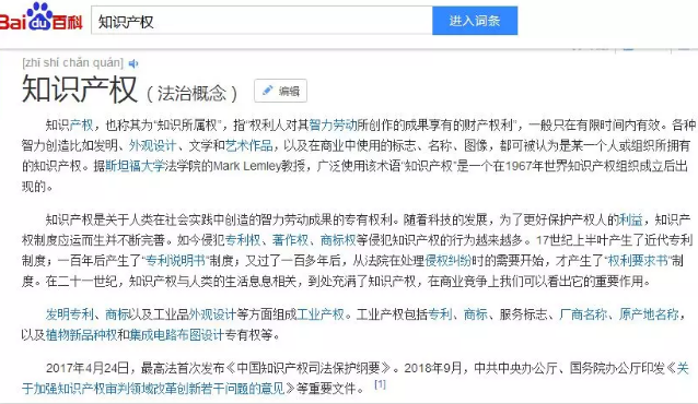 百度百科顯示,知識(shí)產(chǎn)權(quán),也稱(chēng)其為“知識(shí)所屬權(quán)”,指“權(quán)利人對(duì)其智力勞動(dòng)所創(chuàng)作的成果享有的財(cái)產(chǎn)權(quán)利”,包括發(fā)明、外觀設(shè)計(jì)、文學(xué)和藝術(shù)作品,以及在商業(yè)中使用的標(biāo)志、名稱(chēng)、圖像等,一般只在有限時(shí)間內(nèi)有效。