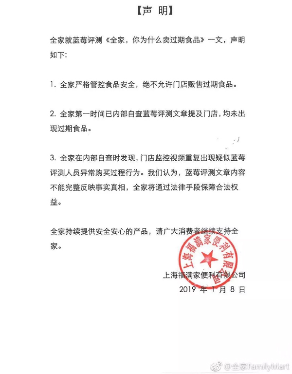 昨日下午14:27,對(duì)于銷售過期食品一事,全家便利店官方發(fā)表聲明稱:全家第一時(shí)間已內(nèi)部自查藍(lán)莓評(píng)測(cè)文章提及門店,均未出現(xiàn)過期食品。在內(nèi)部自查時(shí)發(fā)現(xiàn),門店監(jiān)控視頻重復(fù)出現(xiàn)疑似藍(lán)莓評(píng)測(cè)人員異常購(gòu)買過程行為,認(rèn)為藍(lán)莓評(píng)測(cè)文章內(nèi)容不能完整反映事實(shí)真相,全家將通過法律手段保障合法權(quán)益。