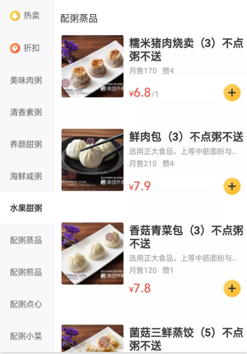 在美團上,簡單翻看幾家粥店,我們就可以發現,眼下火熱的“粥時代”,的確藏了不少關于速凍食品的商機,很多粥店在賣粥的同時,都會搭配很多諸如燜面、餅、油條、蒸餃、奶黃包、燒麥、包子等食物,名義上是配餐,實際上市場銷量是非常可觀的。