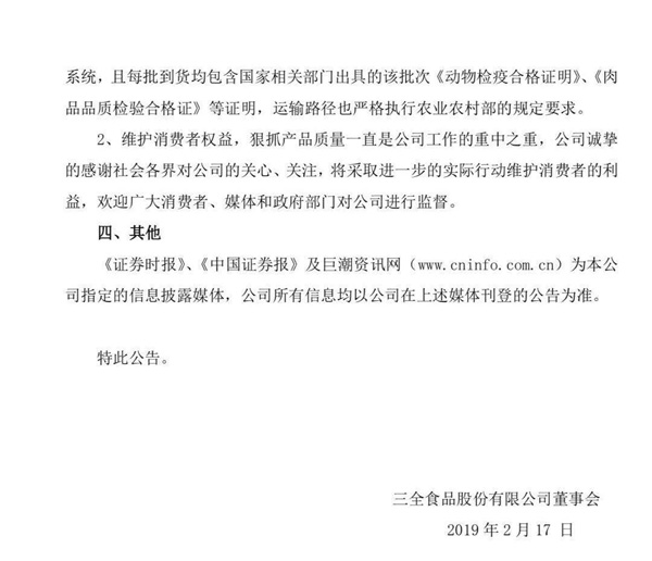 三全食品在公告里提到,公司所用豬肉均來自優質合規供應商,對每一批次的原料豬肉都有溯源系統,且每批到貨均包含國家相關部門出具的該批次《動物檢疫合格證明》、《肉品品質檢驗合格證》等證明,運輸路徑也嚴格執行農業農村部的規定要求。