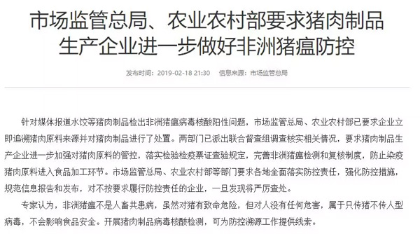 晚上9點30分,國家市場監管總局、農業農村部也發話了,要求豬肉制品企業進一步做好非洲豬瘟防控。