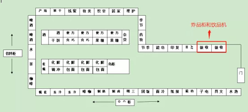 上圖是日本便利店在商業區的布局圖。從圖中可以看出,日本的店鋪在收銀臺放置了他們主推的炸制品和飲品。(布局源于2017年6月到日本學習時的羅森店)