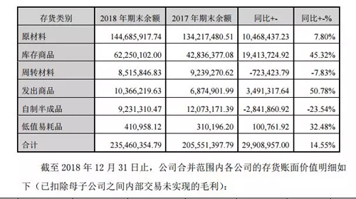 1、截至2018年12月31日止,公司合并報(bào)表存貨項(xiàng)目同比增加29,908,957.00元,同比增長(zhǎng)14.55%,具體數(shù)據(jù)如下表: