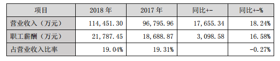 報(bào)告期公司計(jì)提職工薪酬21,787.45萬(wàn)元同比上年增長(zhǎng)16.58%,低于營(yíng)業(yè) 收入的增長(zhǎng)幅度,職工薪酬占營(yíng)業(yè)收入比率同比下降0.27個(gè)百分點(diǎn),詳見(jiàn)下表: