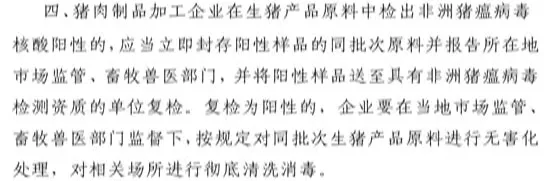第四,公告明確,豬肉制品企業在檢出生豬原料中非洲豬瘟病毒核酸陽性的,應該如何處置。