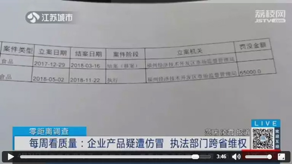 福州市市場監管局檔案材料顯示,2017和2018年兩次被檢測有質量問題,產品質量不合格,一起案件被罰款6.5萬元,另一起因案情重大,被移交公安機關處理。