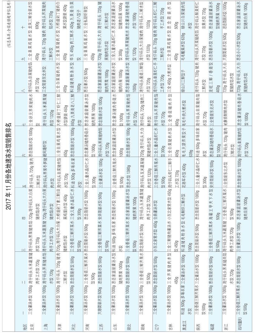 來源: 冷凍食品網(wǎng) 發(fā)布者:編輯▼2017年11月份各地速凍水餃銷售排名