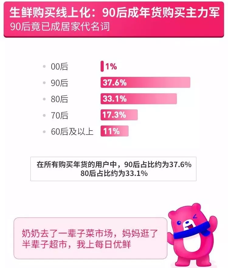 從每日優(yōu)鮮的用戶數(shù)據(jù)看,2018年生鮮年貨的購(gòu)買用戶多集中在80后、90后群體,其中90后占比最高為37.6%,80后占比33.1%。此外,電商渠道并非年輕人的“專利”,60后用戶占比約為11%。