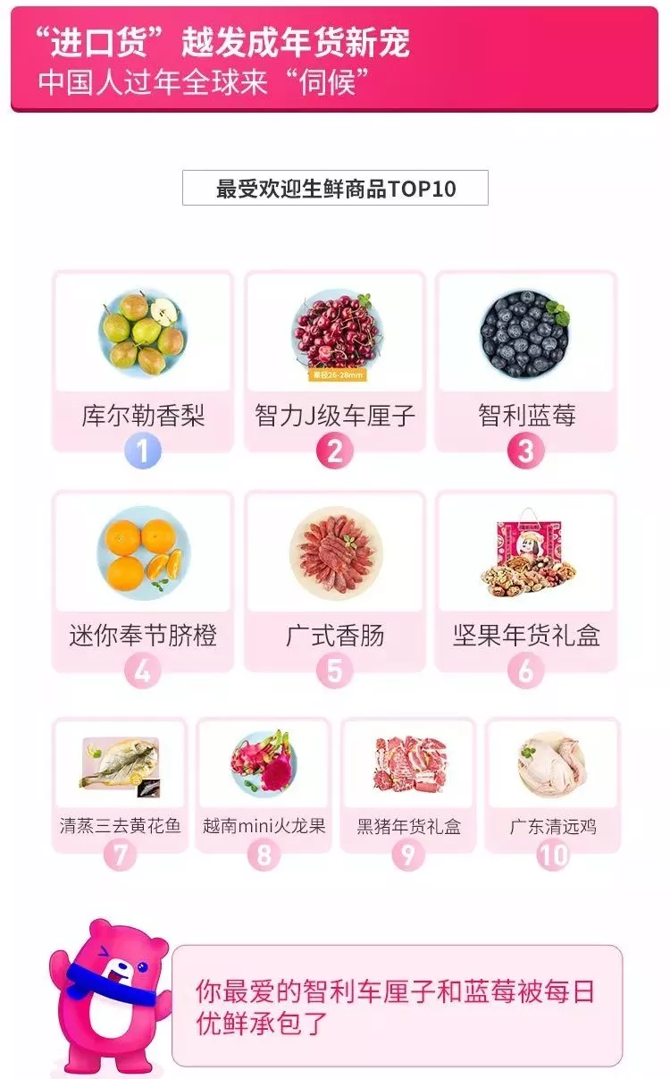 從整體生鮮品類來(lái)看,水果、肉類和乳品占據(jù)品類TOP榜前三位置。隨著國(guó)人飲食日益健康化,水果的受歡迎程度持續(xù)走高,占比約為25.7%。值得注意的是,在最受歡迎的十大生鮮年貨商品排行中,庫(kù)爾勒香梨、廣式香腸、黑豬年貨禮盒、智利車?yán)遄印⒅抢{(lán)莓、越南mini火龍果排名靠前,成為國(guó)人年貨新寵。
