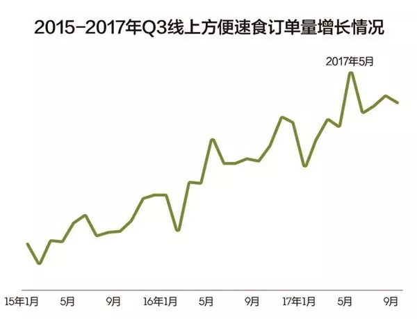 貝恩在《2017年中國購物者報告》中提到,2013—2016年,用于家庭烹飪的食物消費量每年增長約3%,而相同時間內,外賣市場的年增速約為44%。從阿里數據(淘寶和天貓)來看,方便食品的線上銷量也在不斷增長。