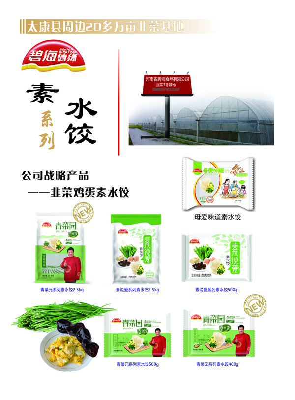 7、現(xiàn)有素水餃:青菜園系列,素說愛系列,母愛味道系列,一只蝦素水餃高、中、低檔產(chǎn)品系列。